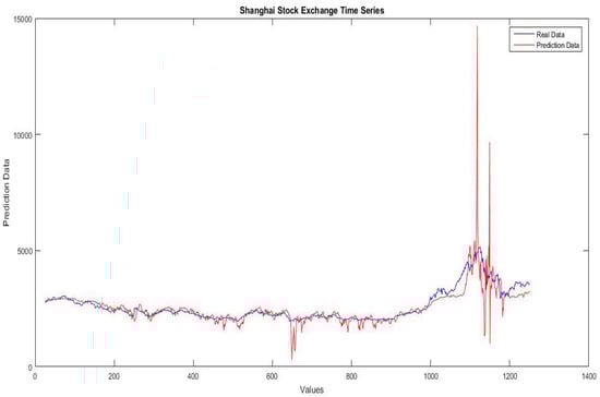 Illustration of the real data against the prediction data of the Shanghai stock exchange time series for the fuzzy neural network using Hamacher and optimized with the dynamic PSO.