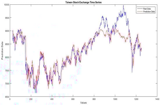 Illustration of the real data against the prediction data of Taiwan stock exchange time series for the fuzzy neural network using Hamacher optimized with dynamic PSO.