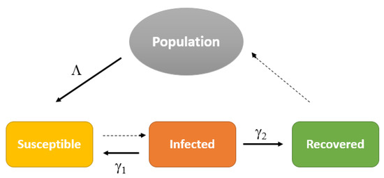 The existent literature has innumerous examples of applications of SIR models, namely in [21,22,23] where the population is divided into Susceptible , Infectious and Recovery However, in SIR models, recovered individuals are assumed to develop lifelong immunity, which for some diseases such as seasonal flu, influenza or venereal diseases is not necessarily true. A recovered individual becomes susceptible and possibly infected after some time. In this case, SIRS models, where recovered individuals lose immunity and become susceptible again, are far more adequate. Examples can be found in [24,25,26,27,28,29]. In [30], the authors develop and explore a mathematical model of an SIRS epidemic model where a transfer between infectious and susceptible rate is included, as shown in Figure 1.