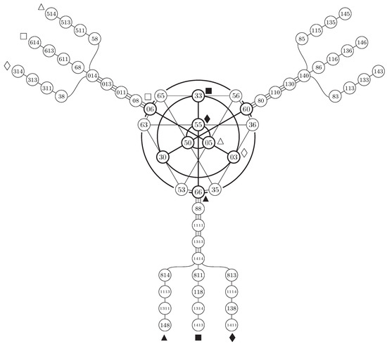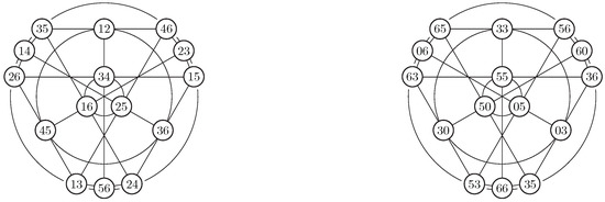 We shall show that the way in which these free cyclic submodules are interwoven is intricately related to the structure of the generalized quadrangle of order two, the doily. To this end, we employed a duad-syntheme model of the latter (see, for example, [2]). Take a six-element set . Let us call a two-element subset of S a duad, and a set of three duads forming a partition of S a syntheme. Then, the point-line incidence structure whose points are 15 duads and whose lines are 15 synthemes, with incidence being containment, is isomorphic to the doily. The structure of the doily is illustrated in Figure 1 (left). Here, the points of the doily are represented by circles, labeled by duads, and its lines are represented by nine straight segments, three concentric circles, and three arcs of circles; one can readily check that each line corresponds to a syntheme. Next, we employ the following bijection between the 15 duads and 15 nontrivial vectors , where and :