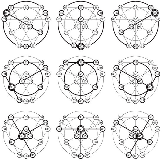 We thus get a new labeling of the points of the doily in terms of these particular non-unimodular vectors of , as illustrated in Figure 1 (right). From a comparison of the latter figure with Table 1, it follows that each submodule shares with the doily seven vectors, forming three concurrent lines—as depicted in Figure 2. From this figure, one can easily discern that six lines of the doily have a different status than the other nine, as each of them belongs to three submodules. Given the fact that each point of concurrence belongs to two such lines, the nine points and the six lines are found to form inside the doily a point-line incidence structure isomorphic to the generalized quadrangle of type GQ(2,1) (see [2]).