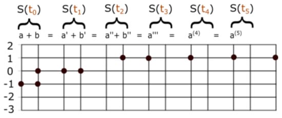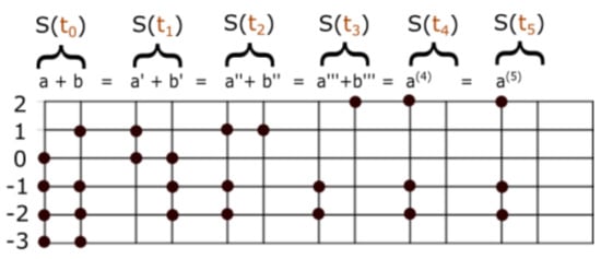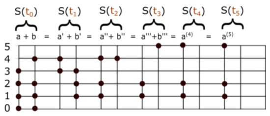 We provide a system that evolves discretely in time. To pass from a state to , we form two new columns. The left column of state is occupied in the energy levels that were not repeated in the previous state . The right column of state is occupied in the energy level if the energy levels and were both occupied during the state . To find the set number sum of two set numbers, we merge the two columns into a single column, by applying our sum formula. The right column becomes the empty set in finite steps, and this guarantees our answer. We define . See Figure 1.