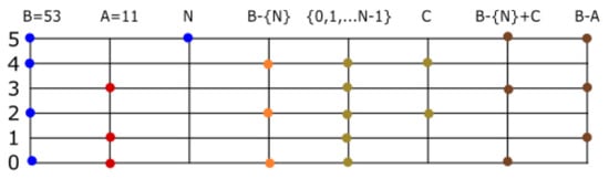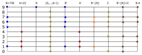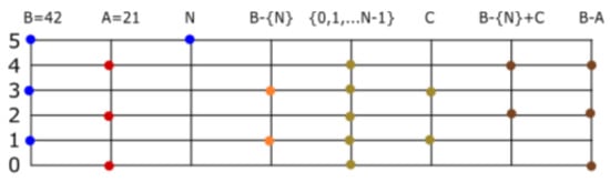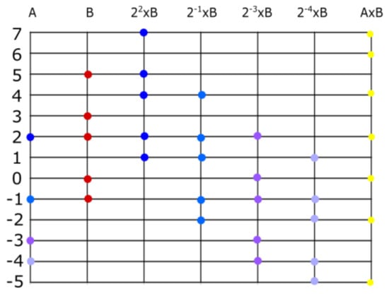 Multiplication by 2 is equivalent to adding 1 to the elements of the corresponding set number. For example, . In general, , where X is the set number corresponding to . Recall . Multiplication by 4, is equivalent to adding to all the elements of X. In general, multiplication by is equivalent to adding k, to the elements of X. That is to say, corresponds to the set number . The unit of this operation, ⊙, is the set number . To multiply numbers that are not powers of 2, we use the distributive property. To multiply , form three new sets (one for each element of 7). These are the sets . Add the results, . Multiplication is defined by the addition of sets that are displacements of an original set number, and a displacement of X is any natural power . To define the product of two set numbers , we will refer to A as the pivot and B as the base. Then, is a sum of set numbers that are displacements of the base. Each displacement corresponds to an element of the pivot. This is illustrated in Figure 6.