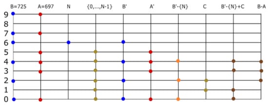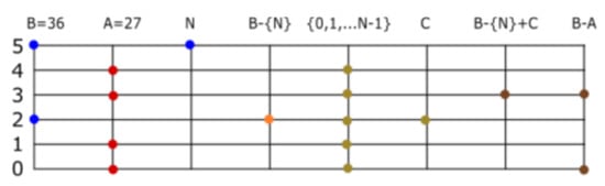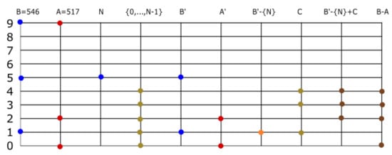 Let be two set numbers (with no additional restriction), and let . We observe where and . The subtraction is treated as in the last paragraph, . This defines subtraction in the most general case (Figure 11, Figure 12 and Figure 13).