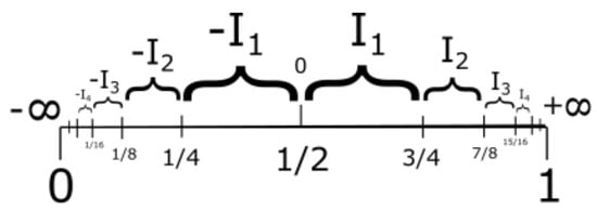We provide two constructions of the real number system. The first method consists of fitting all the real numbers into the unit interval; we use this to define an explicit isomorphism between the set of real numbers and . We want to build the structure of real numbers which is a union of intervals , where and . That is to say, . The intervals will be the intervals , while the will be . The number is identified with in the unit interval, and are 0 and 1, respectively. See Figure 16.