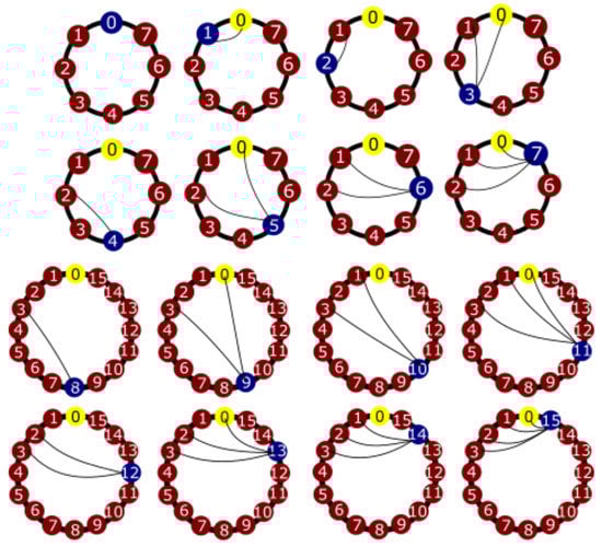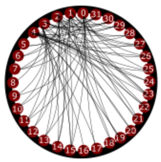 We are showing a diagram of objects and arrows to describe the structure of the natural numbers. The objects are the natural numbers , and the arrows are , , ; , , , , …; , , , , , …; , , , , , (see Figure 18). The pattern that these relations follow is obvious , , , , etc. In Figure 18, we represent the natural numbers from 0 to 31. We arrange the objects along a circumference, and start adding the arrows to obtain Figure 18: