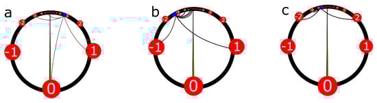 Let us transform the real number line into a circumference. The integers correspond to the discrete points (in red) of Figure 19. These have been determined by successive bisections of the circumference. Given an arbitrary point (blue) on the continuum of the circumference, we have a unique number . At the same time, is a set of integers. Every real number is identified with a subset of the red points. We draw arrows from the red points, corresponding to the elements of , into the blue point that corresponds to x.