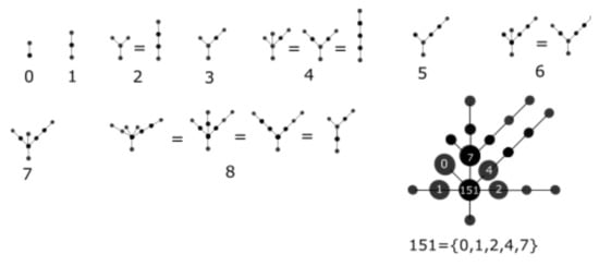 We define an order relation < between set numbers; if . In the contrary case, and we define . Every two set numbers are comparable because the symmetric difference is non-empty and it has a maximum. It is not difficult to see that we have a total order on the family of set numbers . In particular, it is a well order on , if we take as substructure of . We give three examples in Figure 5.