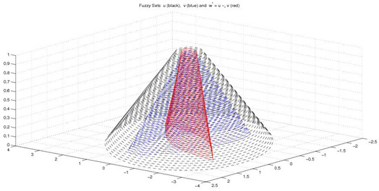 Fuzzy Example 2. Fuzzy sets u (black), v (blue) and fuzzy ct-difference (red).