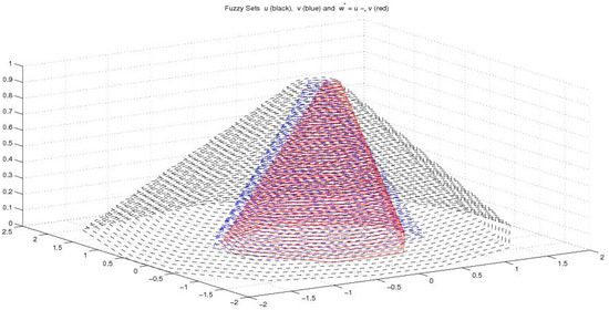 Fuzzy Example 1. Fuzzy sets u (black), v (blue) and fuzzy ct-difference (red).