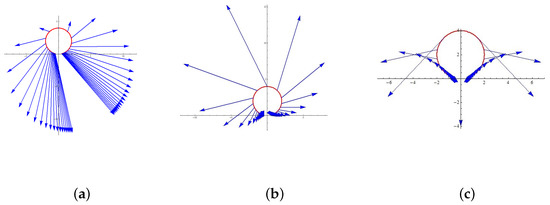 To visualize graphically some slant natural paracontact magnetic trajectories on the unit tangent bundle of along Riemannian circles, Figure 1 below presents the base curve x on , together with the vector field V along it, in the three following situations that correspond to different values for the constants that appeared so far: