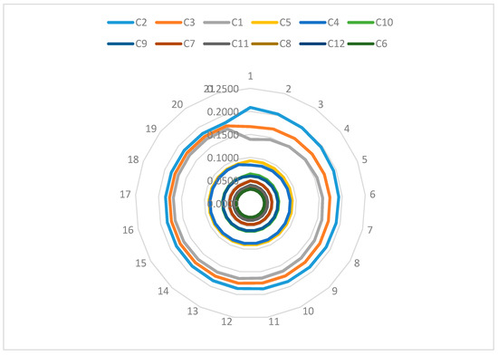Figure 1 is the pictorial representation of the outcome of sensitivity analysis of the results obtained through LBWA. The sensitivity analysis is performed to reduce subjectivity and bias to achieve rational and reliable results [62]. Here, a small sample of experts (i.e., seven) is involved. Hence, the sensitivity analysis needs to be performed, which enables us to check the stability of the final results subject to variation in the conditions [63,64]. In this case, we vary the value of τ from a threshold level (i.e., 4) to higher levels (e.g., 25) and observe whether there is any change in relative positions [36]. We see that the relative weights of the criteria do not change with the change in the condition. From the responses of the SCs, it is evident that C2, C3, and C1 hold the first three positions, and C8, C12, and C6 fall in the lower priority group. This suggests that location and commutation are considered to be more important to aspiring students while they believe that internet availability, language barrier, and amusement are of less importance. However, several B-Schools these days are located on the outskirts of the city. Some of them are operated under residential mode. Hence, location awareness is required, but for residential courses, commutation may not be so important. With the rapid development of information and communication technology, mobile internet speed has increased substantially, and portable routers are also available. Therefore, the internet is not a problem in that sense. Furthermore, many B-Schools in recent years have attempted to design the course to engage the students beyond the classroom, in extra- and co-curricular activities. In addition, cross-cultural teamwork has become an inevitable part of the programs being offered by the B-Schools. Therefore, the positions of these criteria are justified.