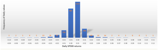 Given the daily S&P500 index time series X, the quantile function (23) deduced from ACF allows the evaluation of where in our experiments p is equal to . Consequently, gives the maximum risk, for the time horizon of one day, for the of the cases.