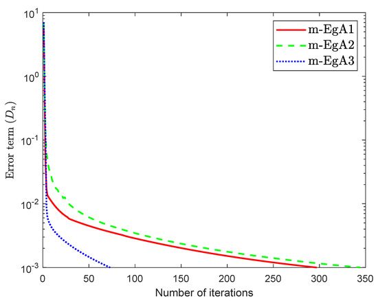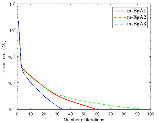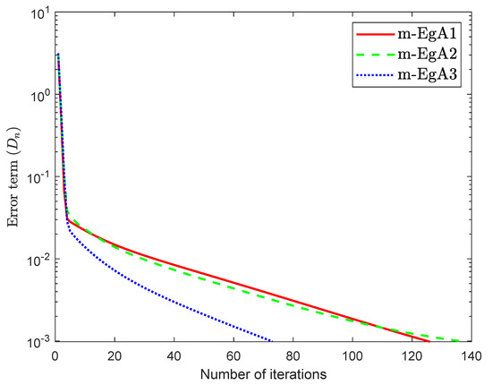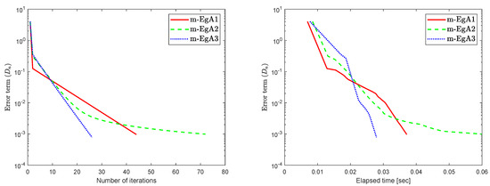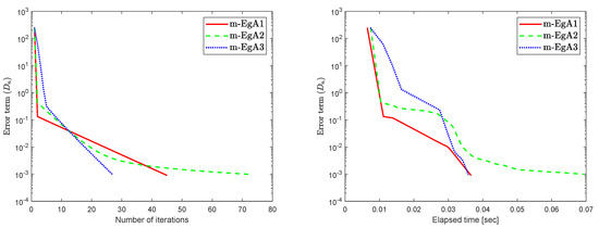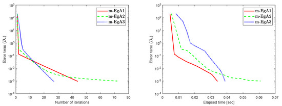 We can see in [41], that F is Lipschitz-continuous with Lipschitz constant and monotone. Figure 9, Figure 10 and Figure 11 and Table 2 show the numerical results by taking different initial values and In this experiment, we take the different initial points and Moreover, the control parameters and for Algorithm 1 (m-EgA1) in [30]; , and for Algorithm 2 (m-EgA2) in [30]; and for Algorithm 1 (m-EgA3).
