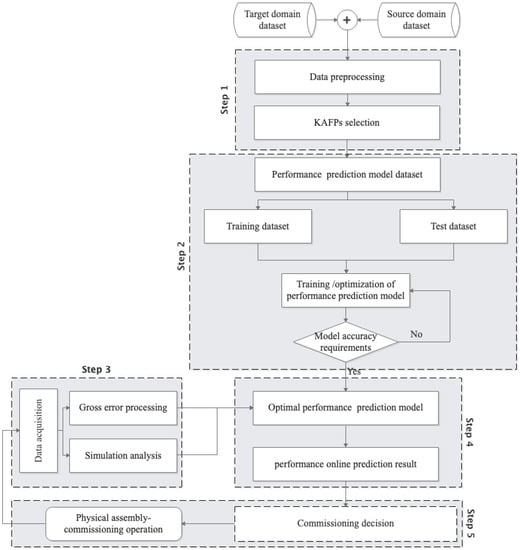This section introduces the performance prediction process supported by digital twin assembly-commissioning technology. As shown in Figure 3, the performance prediction process includes five steps: (1) selection of KAFPs, (2) construction and optimization of the performance prediction model, (3) measurement data acquisition and correction, (4) online performance prediction, and (5) commissioning decision.