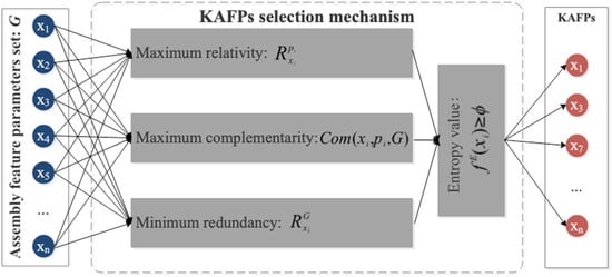 The method based on IE measures the correlation between features by quantifying the uncertainty of the action law between features. It is suitable for the analysis of complex correlation [34] and makes the selection of KAFPs interpretable. This research utilizes IE for the selection of KAFPs. As shown in Figure 4, the entropy of KAFPs are designed based on comprehensive consideration of correlation, complementarity, and redundancy. When a performance index and assembly feature parameters set are known, the correlation between assembly feature parameters and performance index is measured. The calculation method is shown in Equation (1). When the candidate parameters are the first assembly feature parameters identified, that is, the KAFPs set is an empty set, the candidate parameters are screened only by the correlation between the candidate parameters and the performance index . When the KAFPs set is not empty, the assembly feature parameters with maximum correlation, maximum complementarity and minimum redundancy are selected by comprehensively considering three kinds of correlation relations.