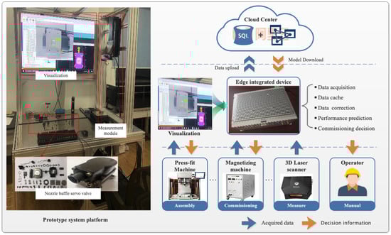 The network environment of the digital twin assembly-commissioning system is deployed in this case, as shown in Figure 7. The physical environment includes a commissioning platform, visual board, digital measuring equipment, assembly and commissioning device and edge machine. As an edge layer device for performance prediction, the edge machine is deployed around the assembly and commissioning device. In the data measurement of the assembly process, we installed the measurement module on the experimental platform. In addition to the ammeter and electromagnetic flowmeter, we mainly measure the assembly geometric feature parameters by a 3-D laser scanner (LMI Gocator). The maximum assembly accuracy of the servo valve is 10 µm, while the maximum measurement accuracy of the 3-D laser scanner is 1 µm, which can meet the measurement accuracy requirements.