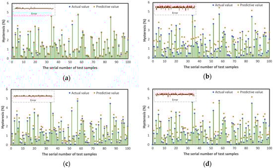 In this case, 2200 groups of data of 11 similar models are selected as the data source. Among them, 10 types of assembly process data are selected to construct the source domain data set, and the total number of samples in the data set is 2000 groups. The target domain data set is constructed from the assembly process data of the remaining one model, in which 100 groups of data samples are randomly selected as the test set. In addition, the remaining 100 groups of data samples are set as the training set for training. In order to verify the superiority of the prediction model, this case compares the error between the prediction results of IE-TrAdaboost, IE-ANN, IE-SVR, and IE-RF models and the actual value. Simultaneously, EVS, MSE, MAE, and R2 are used to evaluate the model’s performance. In the construction of the model, we selected 11 KAFPs as inputs and one output (hysteresis value). The parameters of each model are shown in Table 6.