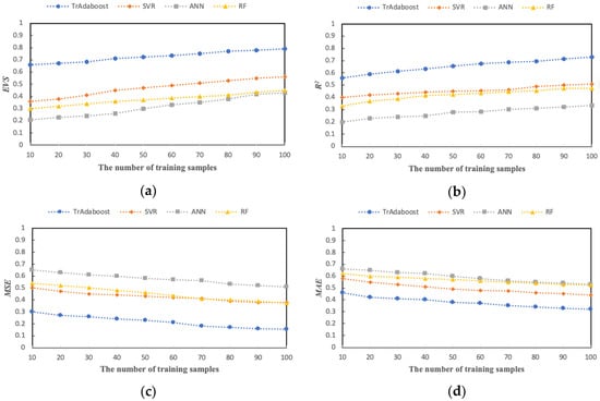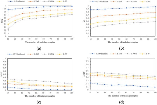As shown in Figure 9, each prediction model is trained with the data set selected from the KAFPs to obtain the evaluation results, in which the evaluation results are normalized. The evaluation results show that IE TrAdaboost performs best in the four evaluation indexes and IE-ANN performs worst. At the same time, with the continuous increase of sample data, the performance of various prediction models is improved. This means that when the sample data size reaches a certain degree, the accuracy of various prediction models is excellent.