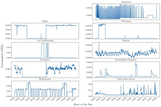 Currently, the database has information on the period from January 2020 to December 2021, with a gap from January 2021 to April 2021 due to modifications made to the smart meters used, resulting in a total of 19 months of data. Figure 2 shows load profiles of minute granularity in a weekday from different appliances monitored, such as television, refrigerator, computer, air conditioner, and living room light bulbs.