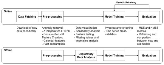 The online pipeline, on the other hand, albeit similar to the offline environment, has differences regarding the degree of automation, runtime constraints, and error handling. In the first stage of the pipeline, which only occurs in online environments, the automated search for data is performed, either in internal databases or through external interfaces, requiring the correct handling of exceptions due to unavailability or transfer errors. The next pre-processing step includes feature cleaning and engineering, in addition to the treatment of anomalies and missing values performed manually in offline environments.
