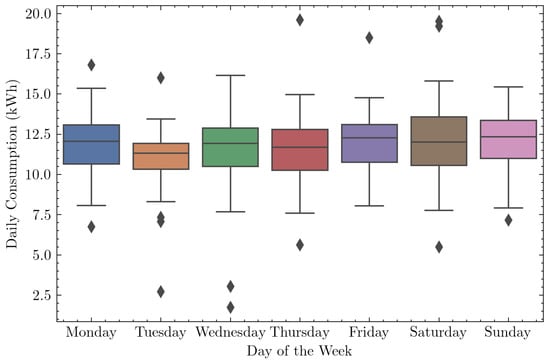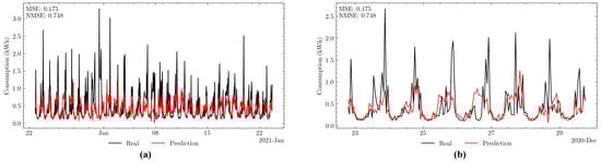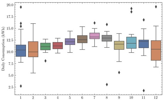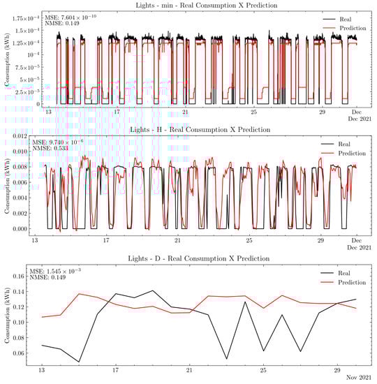 Residential energy consumption forecasting can be used to assist residents in decision making and conscious spending planning [] and utilities in medium-scale and large-scale prediction and detection of customer consumption anomalies []. They can also facilitate energy transactions between prosumers in peer-to-peer (P2P) energy markets [,], promoting the efficient use of the power grid. Home Energy Management Systems (HEMS) can use consumption prediction as an input for predictive control models [], assisting in planning the usage of controllable applications, such as washing machines, air-conditioning systems, and electric vehicles, in order to optimize the use of energy co-generation and financial savings for users in variable energy tariff schemes.