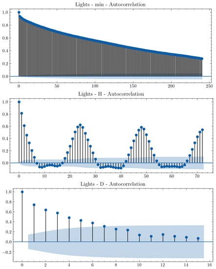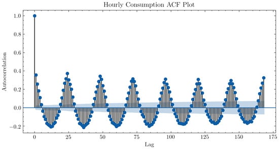 In order to create value for residential consumers, it is important to capture the multiple seasonalities and trends in their energy consumption. Energy Consumption has complex seasonality [], with hourly, daily, weekly, and yearly components. In order to better analyze them, the Auto Correlation Function (ACF) plot can be used to compare similarity between time series and its lagged versions.
