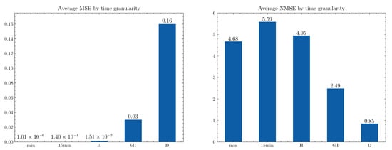 In [], the time granularity for consumption forecasting was chosen by using the Mean Average Percentage Error (MAPE), while [] used the Normalized Root Mean Squared Error (NRMSE). In both cases, the normalized errors tended to favor low frequencies of granularity (hourly or daily), while resulting in greater errors for high frequencies (minutely). Conversely, non-normalized errors such as Mean Absolute Error (MAE) or Mean Squared Error (MSE) favor high frequencies to the detriment of lower ones. Thus, there is currently a research gap due to the inadequacy of using error metrics to choose an adequate time frequency, as the result might be biased according to the metric chosen.