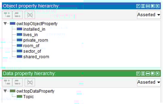 One of the alternatives to model a smart home digital twin that could be useful to our approach is by using ontologies. These semantics-related knowledge representations are understandable by humans and readable by machines. As found in the literature, it is possible to use ontologies to model a smart-home digital twin [,]. For example, a digital twin based on the Web of Things (W3C) description [] is compatible with JSON format and supports SPARQL queries []. Other authors designed modular and independent ontologies with the Protégé editor tool to model a home automation system digital twin with the environment, equipment, resources, and their possible relations [].