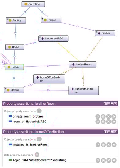 The brother person perspective is depicted in Figure 16. One may observe that the brother has a private room relation with his room. Brother room is a room of Household ABC, and home office and light bulb devices are installed in this room. A conversational agent may use this knowledge to recognize the speaker as the brother, and process the command ‘‘turn my light off’’ to infer that it must switch off the LightBrotherRoom and not another light bulb present in another room, thus saving a conversation iteration for increased usability. The automation command may be issued to the smart home backend based on the MQTT Topic of the LightBrotherRoom device.