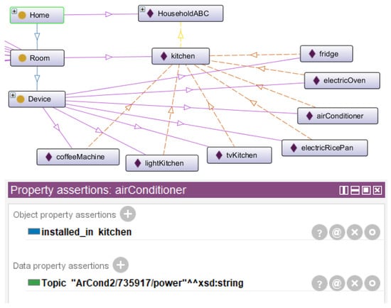 The kitchen perspective shown in Figure 17 may be useful for a smart home automation and energy management system that must know all the devices installed in the kitchen. Based on smart plugs with device-level monitoring, household-level monitoring may be performed based on smart home digital twin ontology.