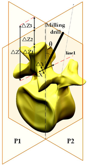 In laminectomy, we need to control the milling drill moving in a fixed posture along the line1 trajectory, which is shown in Figure 1. However, in order to avoid interference with bone tissue during the milling process, it is necessary to make a milling drill with an angle and surface P1. In fact, the proposed robot would first be installed at the end of a 5-DOF hybrid manipulator by fast switching [24]; a hybrid manipulator would then be used to achieve the initial positioning at pose , and then the proposed robot would be used to achieve the milling at a fixed pose. The hybrid manipulator is shown in Figure 2; it is not the focus of this paper and does not require much discussion.