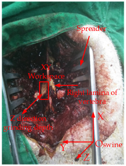Clinically, spinal laminectomy usually requires complete exposure of the lamina to the surgeon’s field of vision under the assistance of a spreader, as shown in Figure 3. It can be observed from Figure 3 that the anatomical size of the swine lamina in the x and y directions of the coordinate system is significantly smaller than the distance from the lamina along the z direction to the skin surface.