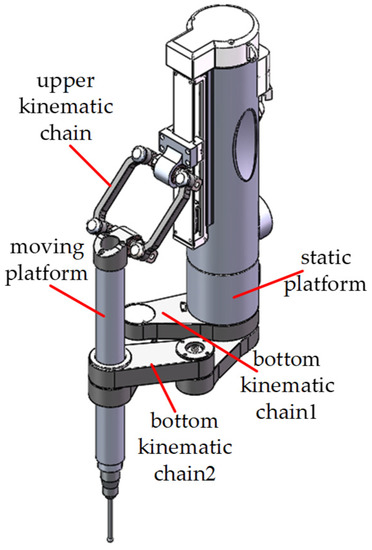 Based on the analysis above, it is difficult for a parallel robot with a symmetrical structure to meet the needs of laminectomy considering the workspace and robot volume. To solve this problem, a 3-DOF space translational robot with an asymmetrical structure is proposed in this paper. As shown in Figure 4, the robot consists of one upper kinematic chain, two bottom kinematic chains, a static platform and a moving platform.