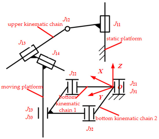 The first task in designing a new robot is analyzing the degrees of freedom to further achieve accurate motion control. It can be seen from Figure 4 that the upper kinematic chain contains a parallelogram mechanism. In order to facilitate the analysis of the degrees of freedom, we simplified the upper kinematic chain and replaced the parallelogram with a generalized kinematic pair [25]. The kinematic sketch of the robot is shown in Figure 5.