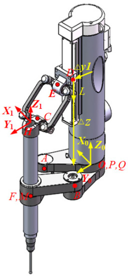 The base coordinate system O-X0Y0Z0 and the end coordinate system H-X1Y1Z1 were established on the robot, as shown in Figure 6. The distance of the initial position of point D in Y direction of the base coordinate system was set as , the distance in Z direction was set as , the length of link DE was set as , the length of link EC was set as , the length of link CH was set as , the control value of upper kinematic active joint was set as L, and the coordinate of point H was set as . Then, the position coordinates of points D, E, C could be derived as , , and , respectively. Finally, the kinematic equation of the upper chain was established based on the length of link EC: