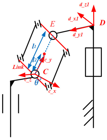We established a coordinate system at point D. The d_y1 axis is from D to E along the link direction. The d_x1 axis is obtained by multiplying the d_y1 axis by the Z axis of the base coordinates. The d_z1 axis is obtained by the right-hand rule, as shown in Figure 7. The coordinate could be expressed as:
