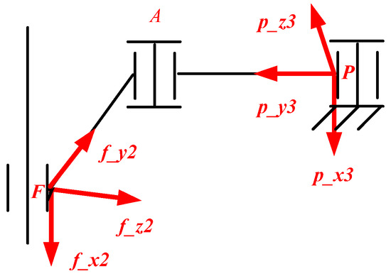 We established a coordinate system at point P. The p_y3 axis points from P to A along the link direction. The p_z3 axis is obtained by cross-multiplication of the p_y3 axis and the Z axis of the base coordinate system. The p_x3 is determined by the right-hand rule. As shown in Figure 8, the coordinate system at point P could also be expressed as: