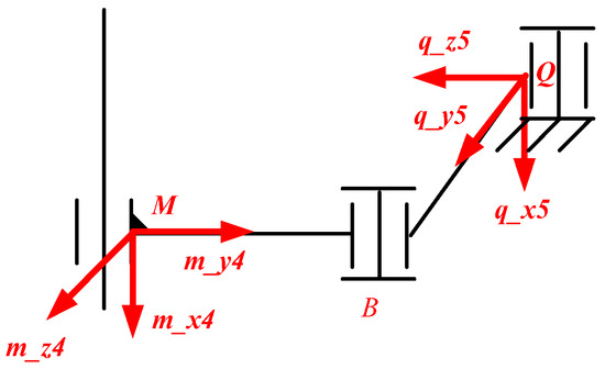 The analysis method of bottom kinematic chain 2 is similar to the way we analyzed bottom kinematic chain 1. The force analysis coordinate system is established as shown in Figure 9, and we directly give the projection of the force of bottom kinematic chain 2 to the moving platform in the base coordinate system as: