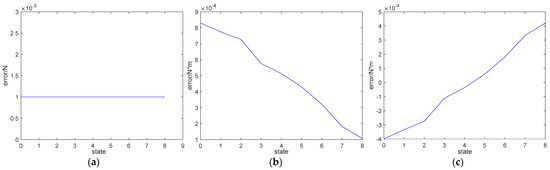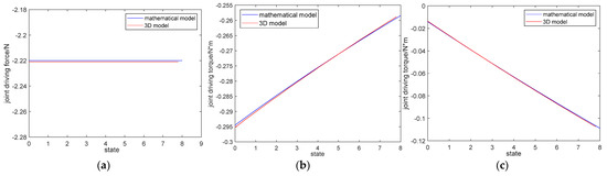 It can be seen from Figure 13 that the mathematical model and the simulation curve of the 3D model were basically coincident under the condition of external load. The error curve is shown in Figure 14. Equation (53) was again used to compute the error, accounting for approximately 1% of the joint force/torque, and the error could be ignored. The causes of error were the same as in Simulation 1.