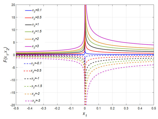 The term in Equation (3) is important, and this element may result in singularity. Figure 1 and Figure 2 illustrate the fluctuation of and versus .