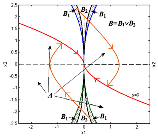 Calculating the boundaries of and is difficult and requires an in-depth understanding of the bounds of uncertainties and disturbances [86]. However, significant here is that the area of is a transition region in which the state does not persist indefinitely. Furthermore, as illustrated below, the state passes through this transient situation and reaches the stability region of A [86].