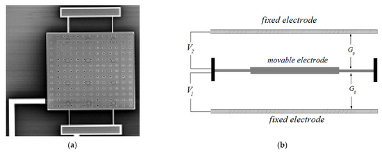Correspondingly, the front view of the structure shown in Figure 4b, illustrates the moving electrode, which is located at a distance from its fixed upper and lower electrodes, and two electrical potentials and are applied to the moving electrode from both lower and upper actuating electrodes. The material of the moving electrode is considered to be homogeneous with a Young’s modulus E, mass density , and cross section area . In this investigation, we considered , , , , , , and .