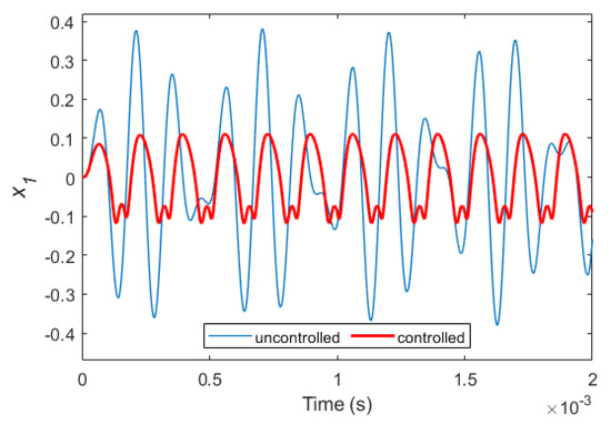 In this section, the generated results for controlling the above micro-capacitor are presented and discussed. It is assumed next that the micro-plate capacitor is first subjected to a disturbance of the following form: and with an inherent uncertainty represented by the following function . The simulation is for a span of , and, in some cases, for more clear trends, we present the results with a shorter timing range. The purpose of this motion is to reduce the effects of disturbance on the dynamic behavior of the microstructure. It is worth noting that, due to the fact that the disturbance is permanent without any decaying, it is not possible to completely eliminate its effects, and the controller can only mitigate them.