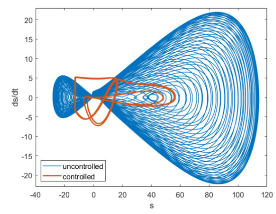 Figure 5 shows the variation of versus time for both controlled and uncontrolled situations. As it is clear from this figure; the controller is able to significantly reduce the effects of disturbance. The specifications of the controller for this simulation are , , and . The phase portrait for a manifold of and its time derivative variation is drawn in Figure 6. As can be seen from this figure, with the application of the control law, the phase limit becomes significantly more compacted.