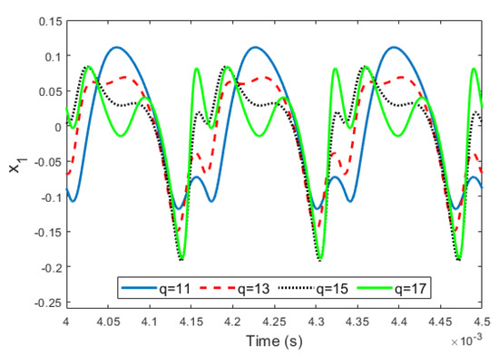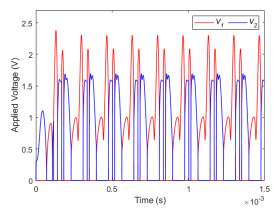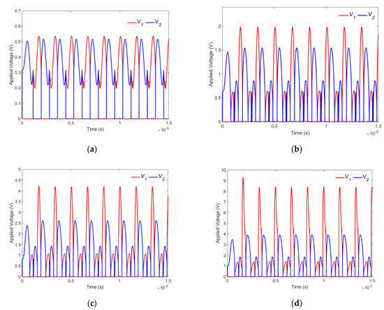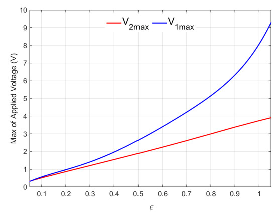 Similarly, the maximum applied voltages and for different are presented in Table 1. From this table, the values of the applied voltages increase with the increase of , and approaches 2. According to the results presented in this table as well as Figure 8 and Figure 9, the controller design is preferable to choosing less or choosing close to one.