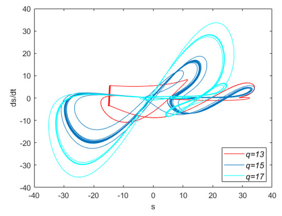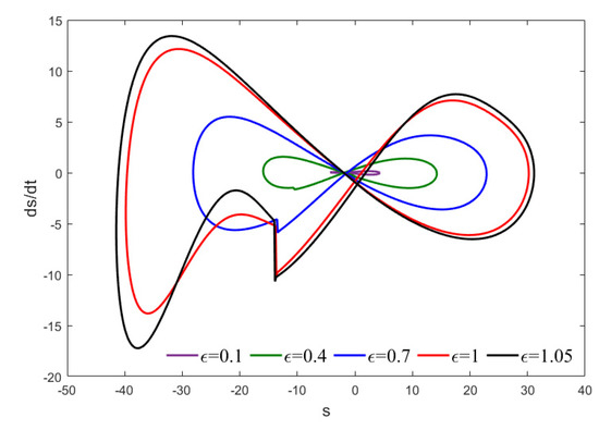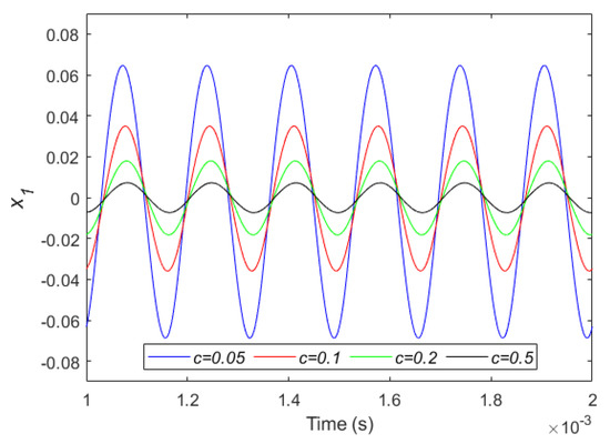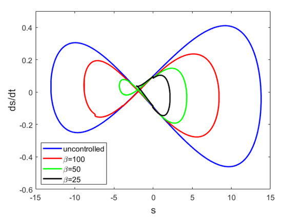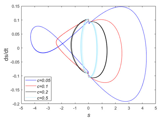 Subsequently, the effects of the damping coefficient on the control of the micro-capacitor are investigated. For this case, we considered , , and . The diagram of for various damping coefficients is demonstrated in Figure 10. As can be seen from this figure, the amplitude decreases with the increase of the damping coefficient. Correspondingly, the phase plane is also depicted for this simulation in Figure 11. This figure shows, with an increase of , that the related phase diagram considerably constricts in the vicinity of origin.