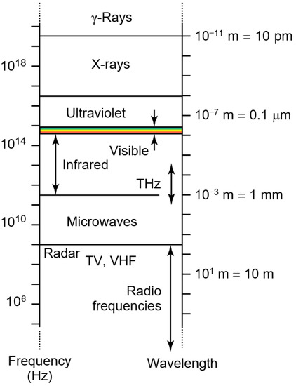 Figure 1 presents an overview of the most common characteristics of EM waves. Visible light, defined by the range over which the light receptors of human eyes can detect, covers a small range within the spectrum, with wavelengths ranging from 380 nm to 780 nm [11].