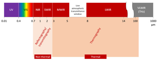 Within the infrared spectrum, some bands exhibit particular characteristics, which affect their applications. The main ranges are near-infrared (NIR, from 0.7–1 μm), short-wave infrared (SWIR, 1–2.5 μm), mid-wave infrared (MWIR, 3–5 μm), long-wave infrared (LWIR, 7.5–14 μm), and very long-wave infrared (VLWIR, from 14 to 1000 μm) [29]. Figure 2 depicts these ranges.