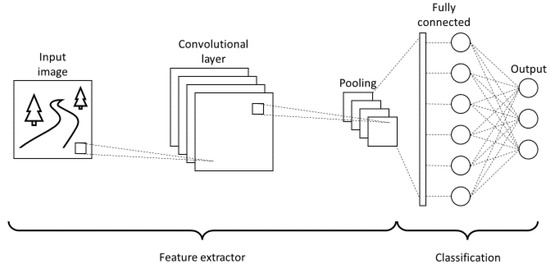 Digital images can be represented by a matrix in which each pixel contains one or more values. First, a CNN trains and tests each input image with the pixel values going through a series of convolution operations with filters (kernels). Then, the results are grouped (pooling) to reduce the matrix dimensions and generate a new, simplified matrix. These operations complete the feature-extraction step. Then, a vector is created from the feature map, which is used to feed the input layer of a multilayer neural network (fully connected, FC) [35]. Figure 3 presents a simplified diagram of a CNN [35,36].
